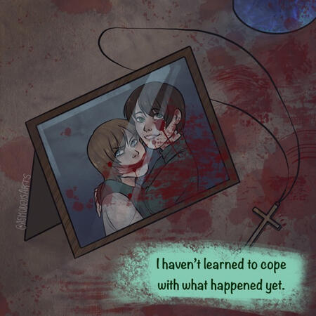he's quiet and observant, talking in a hushed voice and often not talking at all. he's easily confused and has trouble communicating and responding to situations because of his autism and minor brain damage suffered from the blood loss. he is also very emotionally vulnerable. he likes looking for insects or fossils, reading, and knitting. he has a calico cat named dot, who he found her in the woods. he doesn't have DID, sully doesn't exist. he also doesn't kill people, usually just helps the others discard of evidence and keeps watch on missions, although he tries to avoid the subject of murder and crime altogether.