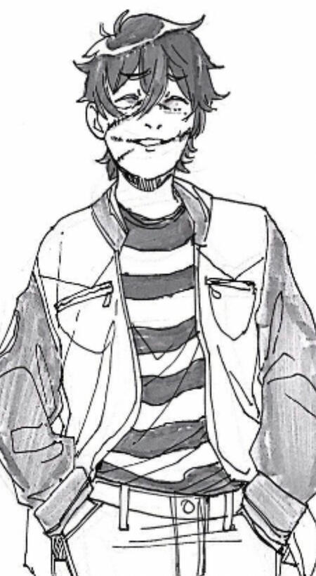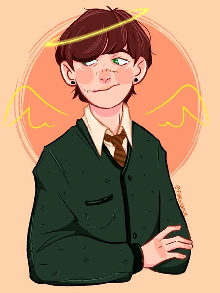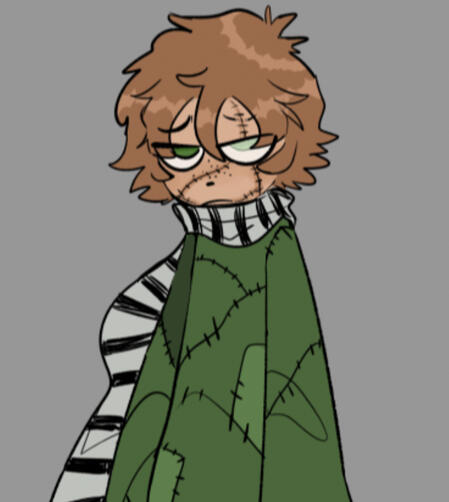 he's 6'2 and has green eyes and brown hair. he's scarred and freckled. he lost a finger and a leg as a result of the incident, he has a prosthetic. he uses lots of layers/long sleeves to cover up his scars. he usually wears clothing such as hoodies, coats, flannel jackets, and pants. his clothes are often monotone colors, sometimes accompanied by green. he also wears scarves, necklaces, and rings.